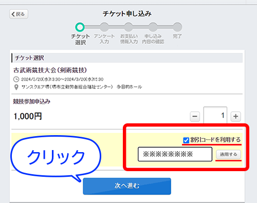 ※ 割引コードをお持ちの方は 【割引コードを利用する】に チェックを入れ、欄内に記入し 【適用する】をクリックしてください
